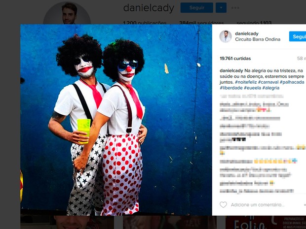 "Na alegria ou na tristeza, na saúde ou na doença, estaremos sempre juntos", disse o nutricionista Daniel Cady ao publicar uma foto ao lado da esposa. Na imagem, eles estão abraçados e fantasiados de palhaços.